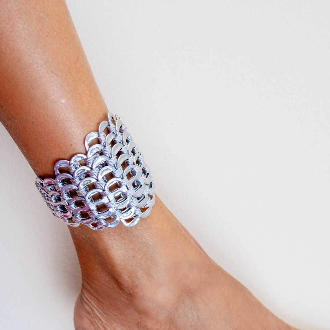Leve, durável e cheia de personalidade, essa pulseira de lata reciclada traz um visual moderno e inovador, ideal para complementar looks casuais ou dar um toque diferenciado ao visual de eventos. Além de apoiar o consumo responsável, você adquire joias que refletem seu compromisso com o planeta.