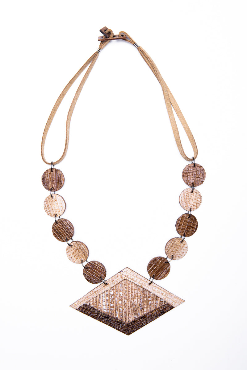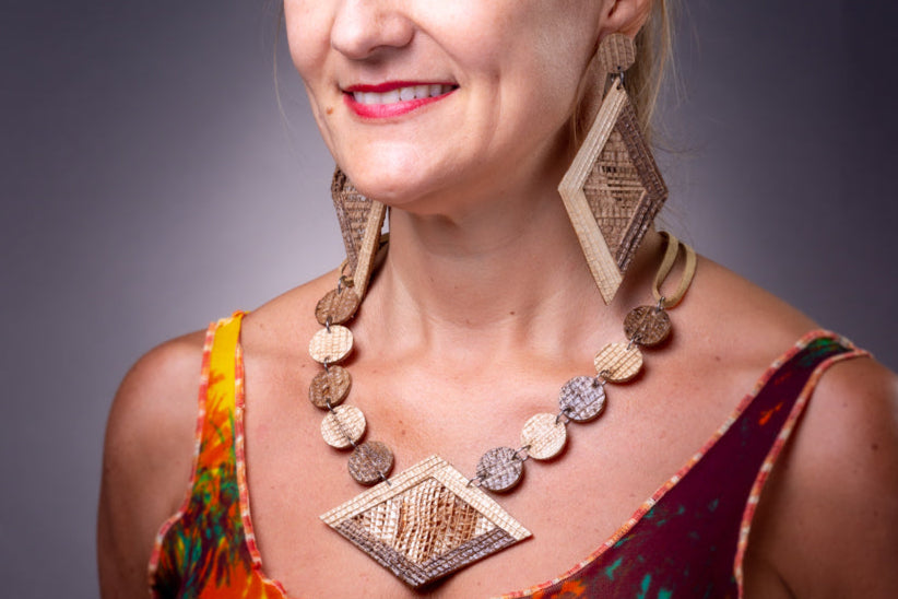 Be enchanted by the rustic and modern charm of our necklaces made with natural banana fiber , a sustainable accessory that combines artisanal design, lightness and purpose . Created for those seeking an authentic style aligned with nature.