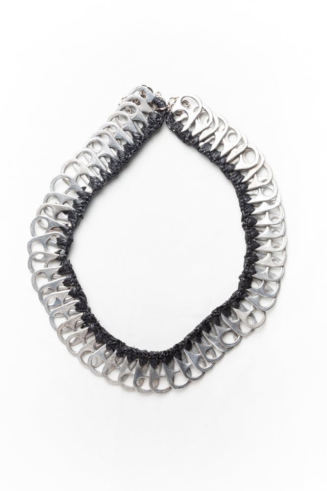 Upcycled, necklace made from tin cans and recycled plastic bags