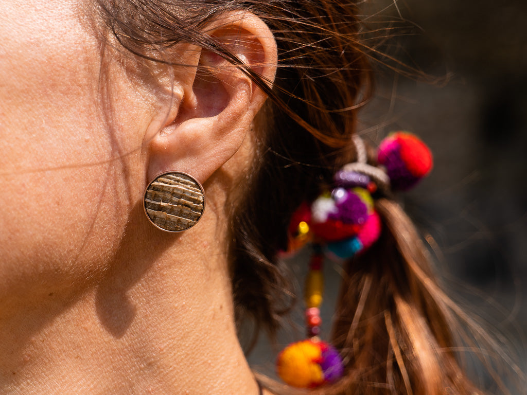 Descubra o charme do nossos brincos de Fibra de Banana com cobre banhado em ouro rosa, uma joia artesanal sustentável feita à mão
