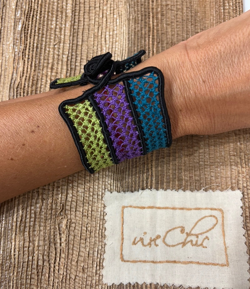 Nossa pulseira de renda irlandesa é feita à mão em três cores harmonizadas, trazendo delicadeza, tradição e modernidade em uma só peça.