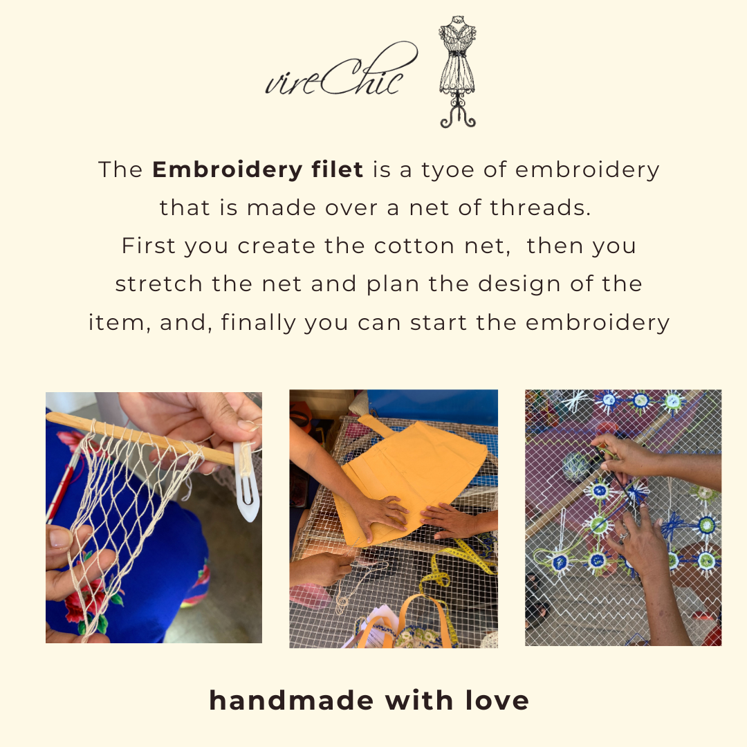 Produzido com técnicas tradicionais de bordado filet e materiais de alta qualidade, este vestido artesanal une sustentabilidade, moda consciente e beleza clássica. Leve, confortável e feito com atenção a cada detalhe, é a peça ideal para valorizar seu estilo com autenticidade e requinte.